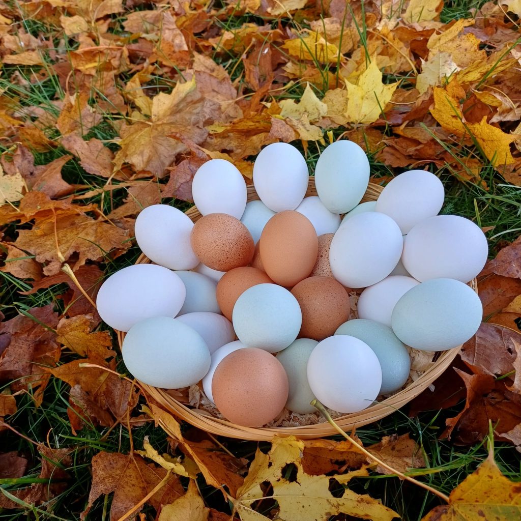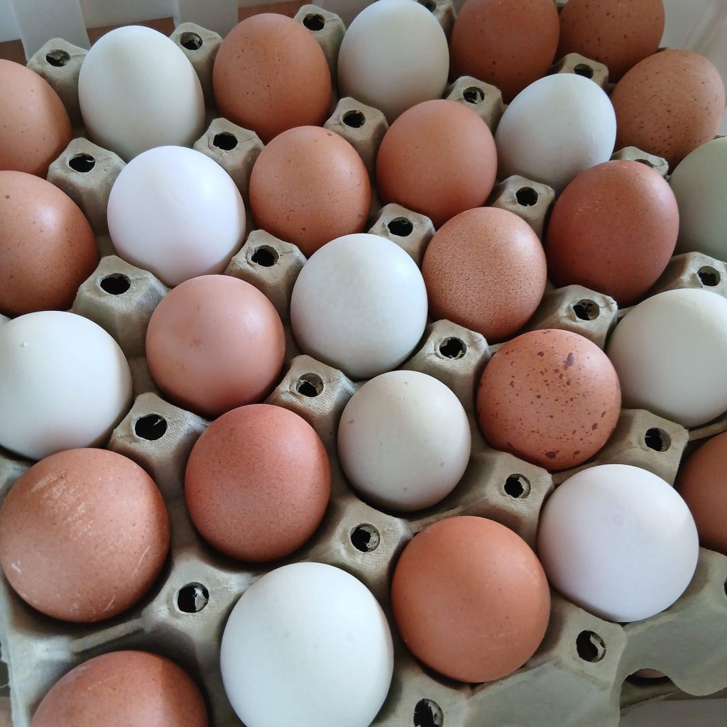 Våra ägg har fantastiska färger och nyanser av renrasiga djur och egna blandningar. De ger olika stora ägg men genomsnittet är ca 60g per ägg på ett flak.