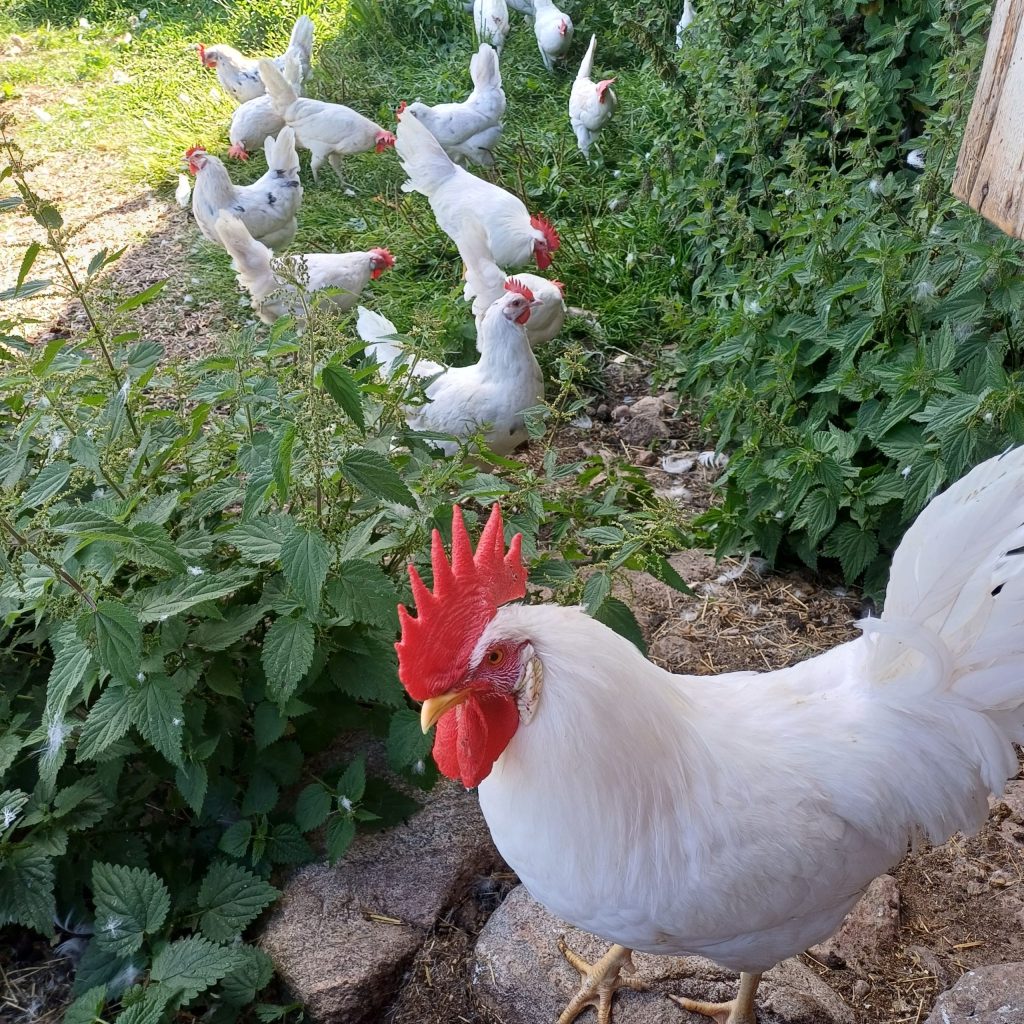 Våra höns är inomhus på vintern i vår äldre ladugård men på sommaren hittar de ut på våra små åkrar för att leva ett naturligt hönsliv. De får då i sig massor av växter och insekter vilket gör äggen väldigt smakrika. Våra hönor lägger 180-250 stycken ägg varje år vilket ger en fantastisk kvalité på äggen men är även skonsam för hönan.